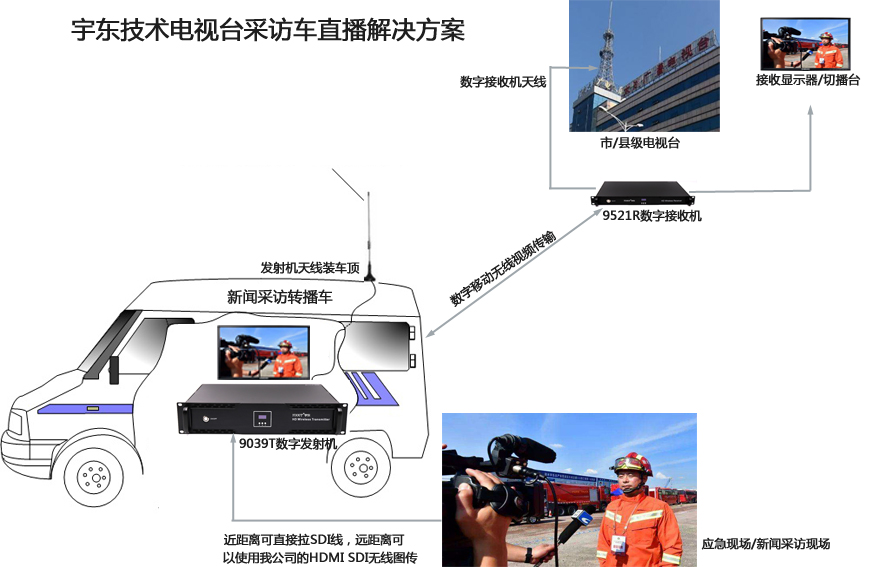 電視臺現場采訪車無線視頻信號遠距離傳輸,直接在車上安裝車載無線圖傳系統,配合車載播出系統切換系統,能實時將多路攝像頭信號,任意切換后通過無線發射,直接在電視臺播出機房接收到現場信號,再通過光纖鏈路,傳輸到電視發射塔,通過開路電視發射出去,也可以通過有線電視線路傳輸。指揮中心或者老百姓就可以通過足不出戶,看到活動場面的實時畫面。