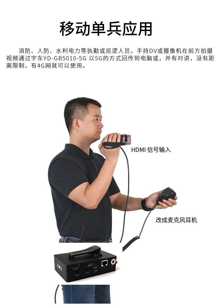 YD-GB5010-5G 高清視頻終端采用嵌入式系統架構,采用高性能H.265 編解碼處理器設計。設備支持視頻采集、編碼壓縮、傳輸、雙向對講功能。