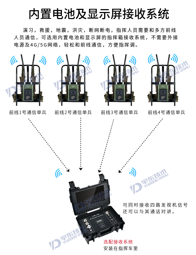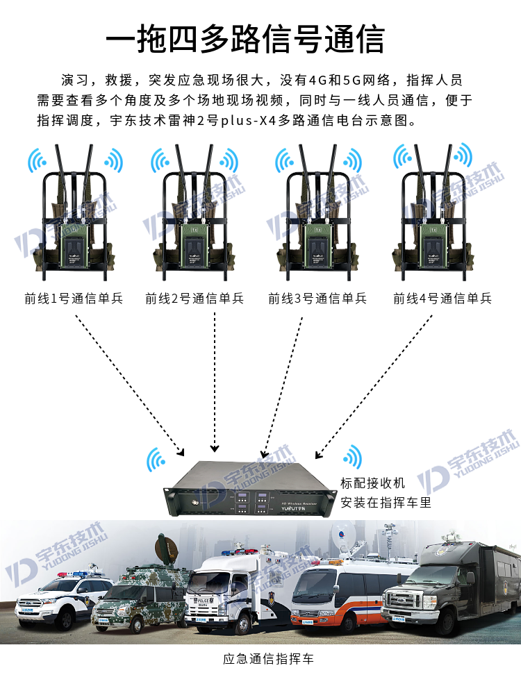 宇東技術雷神2號plus-X4一拖四背負式高清無線圖傳電臺,是應對突發事故,斷網斷電,如地震、洪災、反恐、應急救援、部隊演習等使用通信,本設備由4路背負式單兵發射機電臺和1臺四路接收于一體的接收電臺地面指揮箱組成,指揮箱自帶四路接收模組和顯示器及功能按鍵,可同時接收四路發射機的視頻和對講信號數據,指揮箱自帶揚聲器,可接收DV無線發送現場的聲音數據。支持擴展HDMI外接顯示大屏及插USB錄像保存功能,真正義意上做到及時取證,錄像保存,移動通信,統計指揮調度等。
