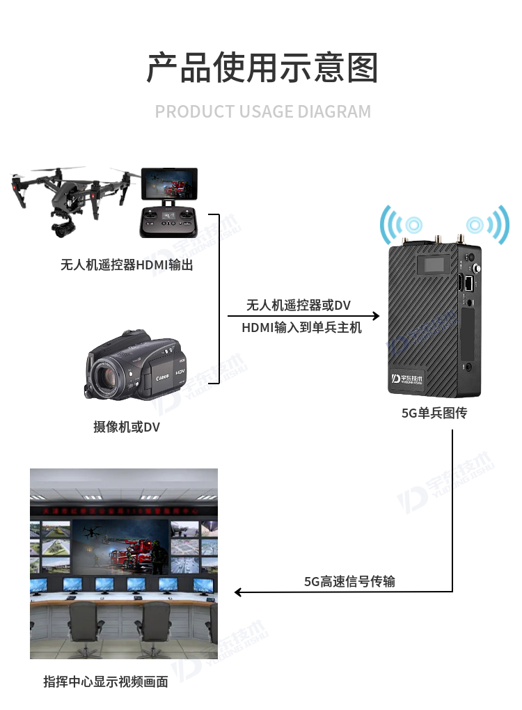 接口與無人機、DV攝像機等攝像設備組合使用。具有輕便小巧、使用靈活方便、功能全面、可靠性高等特點,現場工作人員可以和指揮部通話,接受領導發送的各種指令。